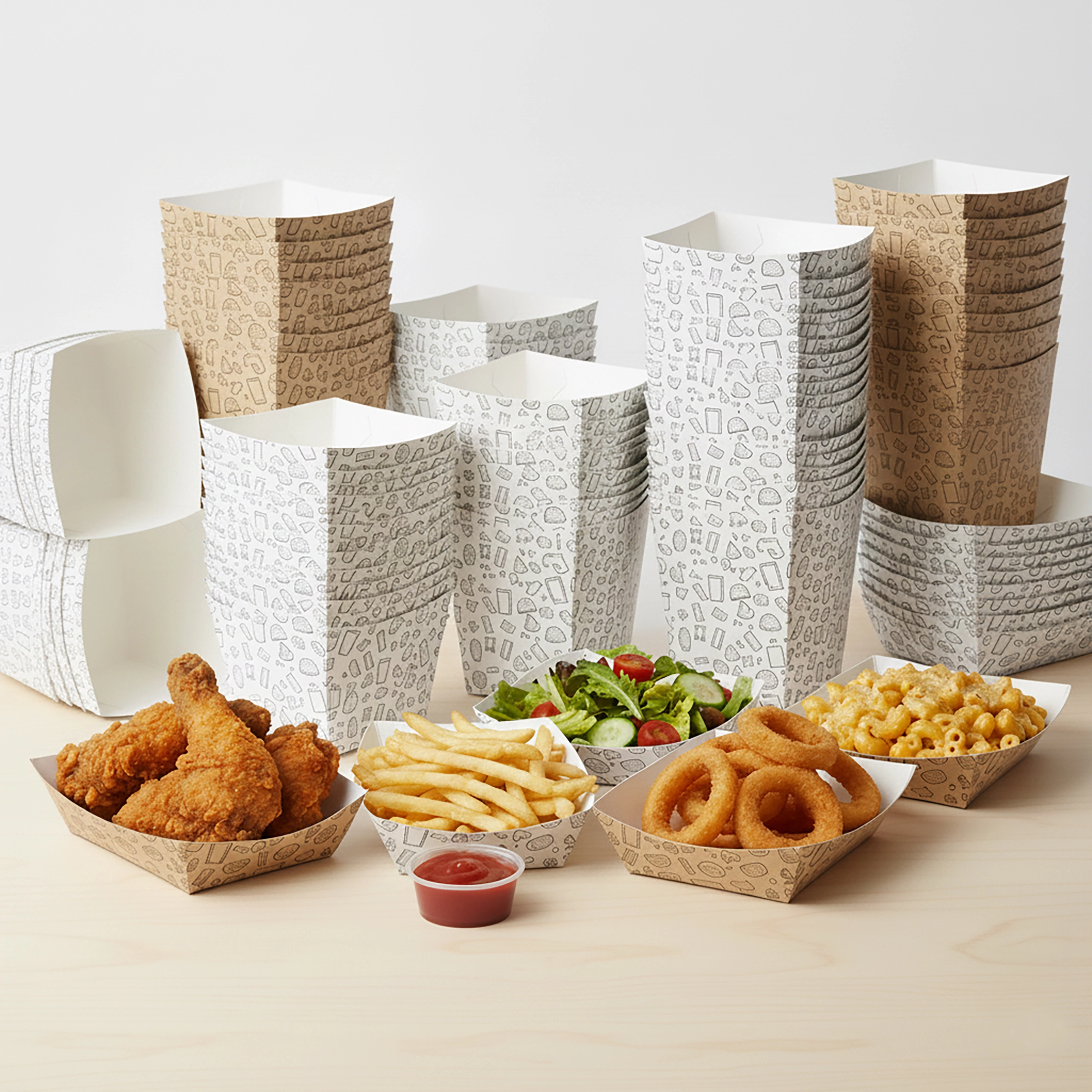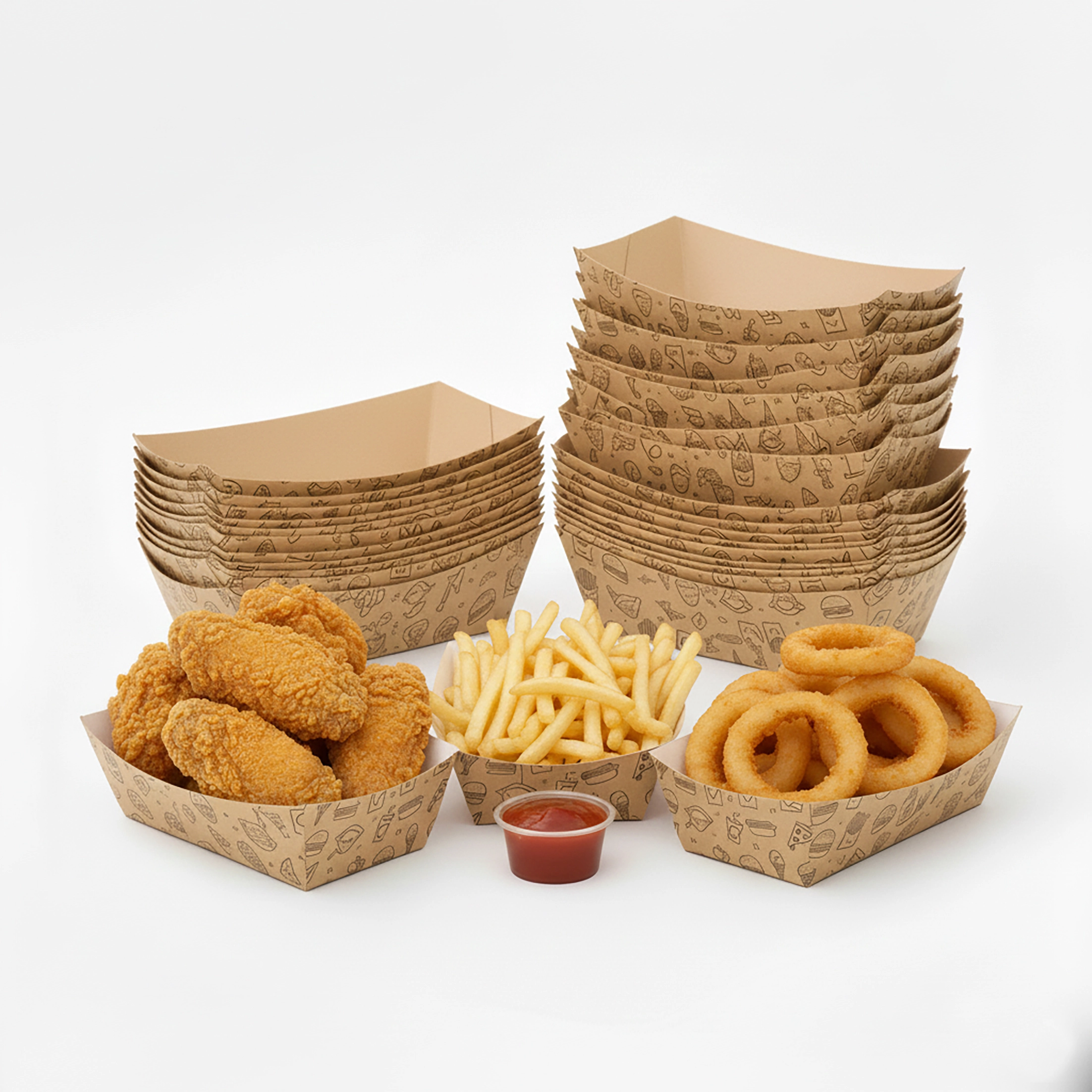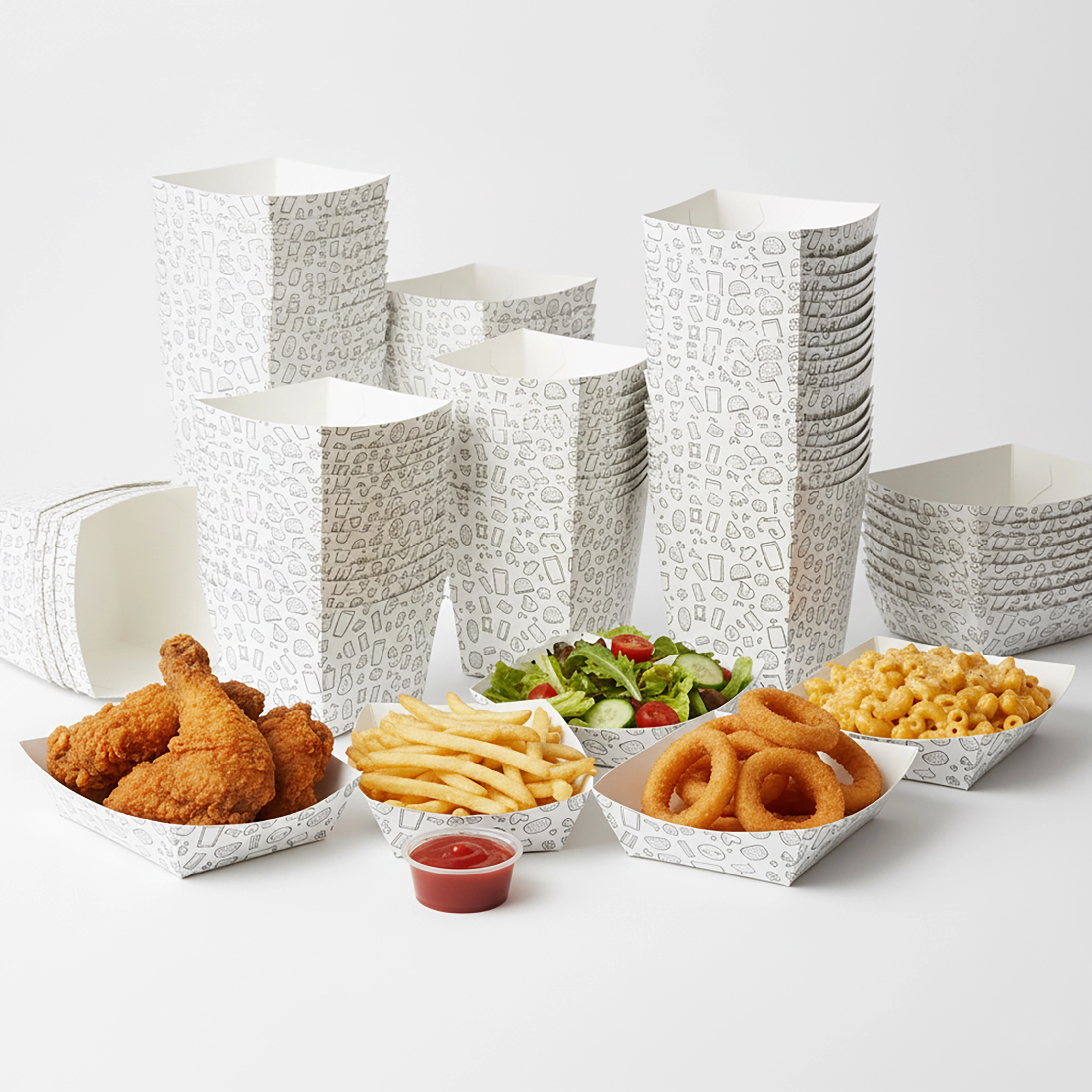 These industrial trays are engineered to work in synergy with our Custom Burger Boxes and Professional Fries Packaging. Produced in our Istanbul hub, they utilize 230-300 GSM high-strength paperboard with a specialized food-safe barrier.